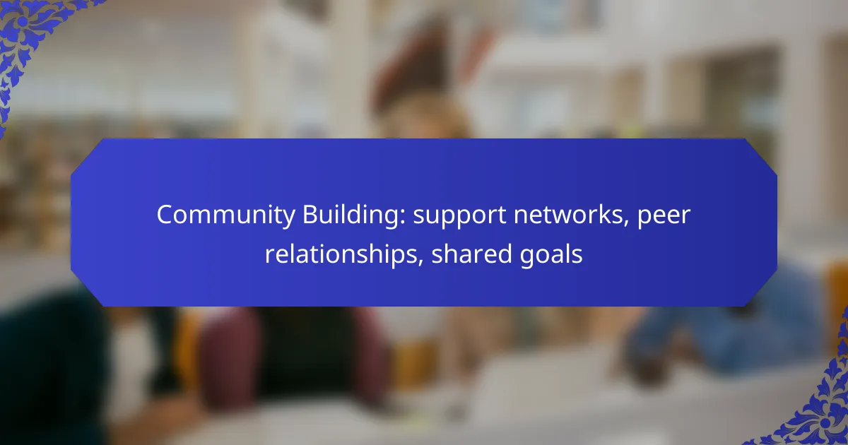 Community building thrives on the establishment of support networks that connect individuals through shared goals and resources. By fostering peer relationships, communities can enhance emotional well-being and collaboration, creating a supportive environment for all members. Identifying common interests and aspirations is crucial, as it unites individuals and strengthens the bonds that hold the community together.