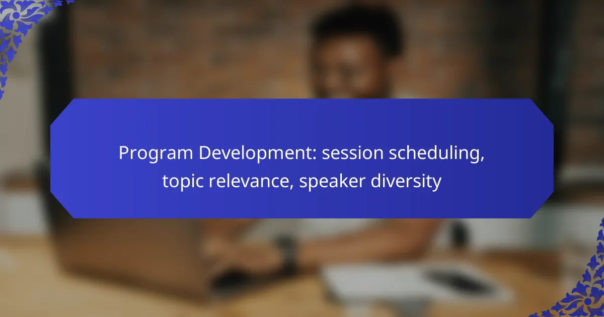 Effective program development requires careful session scheduling, relevance of topics, and a commitment to speaker diversity. By utilizing scheduling tools and considering time zones, planners can enhance participant engagement while ensuring that the content aligns with industry trends and audience interests. Additionally, fostering speaker diversity enriches the program and promotes inclusivity, making the experience more engaging for all attendees.